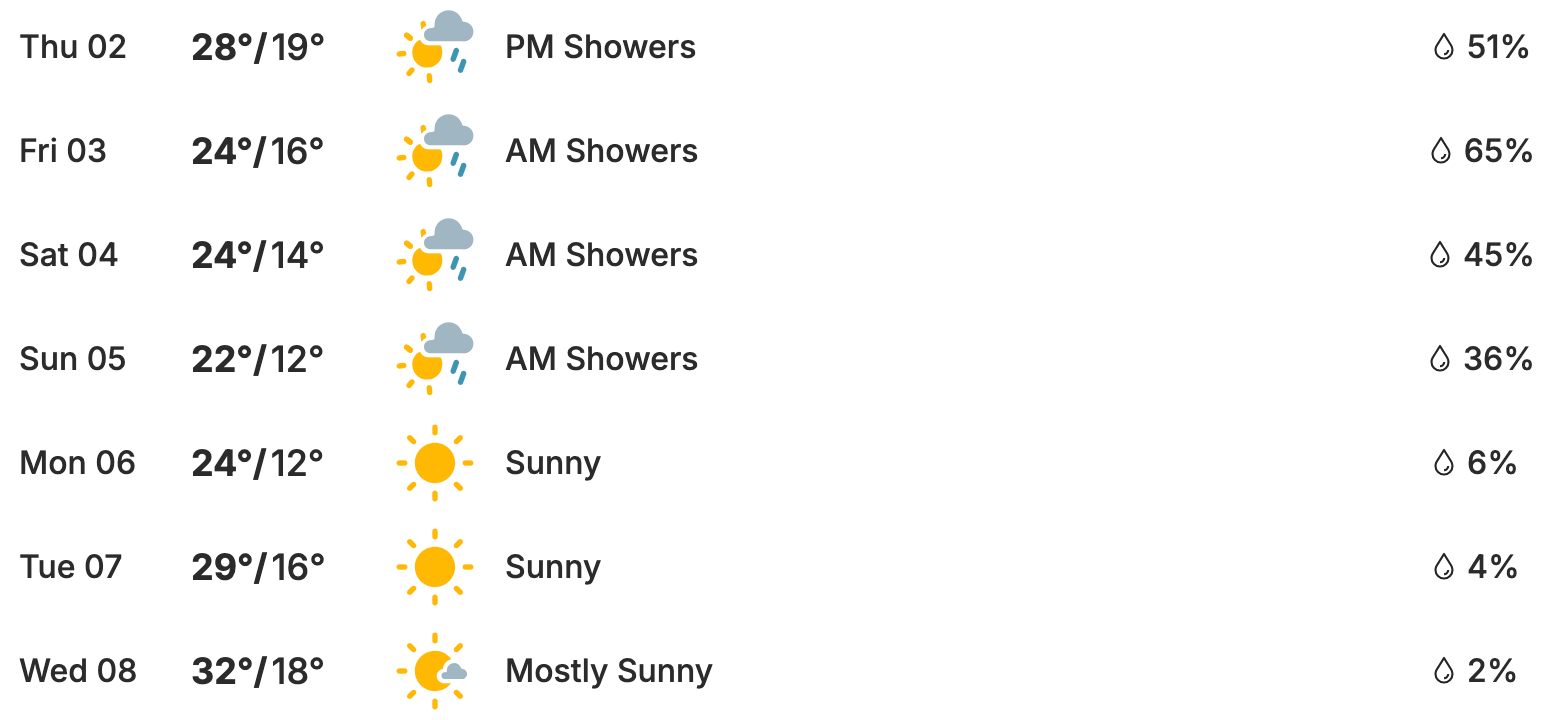 A bit of a mixed bag to start - expect scattered morning and afternoon showers through the weekend, but nothing that should completely ruin plans. From Monday, things turn 👌 with clear skies and a proper return to sunshine.