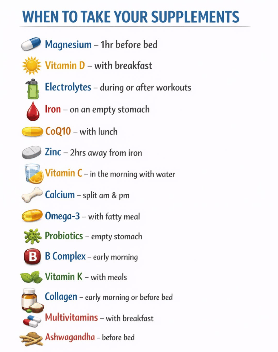 Did you know that when you take your supplements can make a big difference to how well your body absorbs them? Some vitamins work best with food, others on an empty stomach, and a few even compete with each other if taken together.