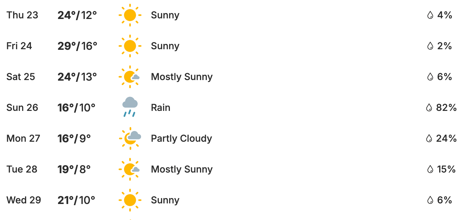 Friday (29°) is your standout day, with Thursday & Saturday also great for plans ☀️