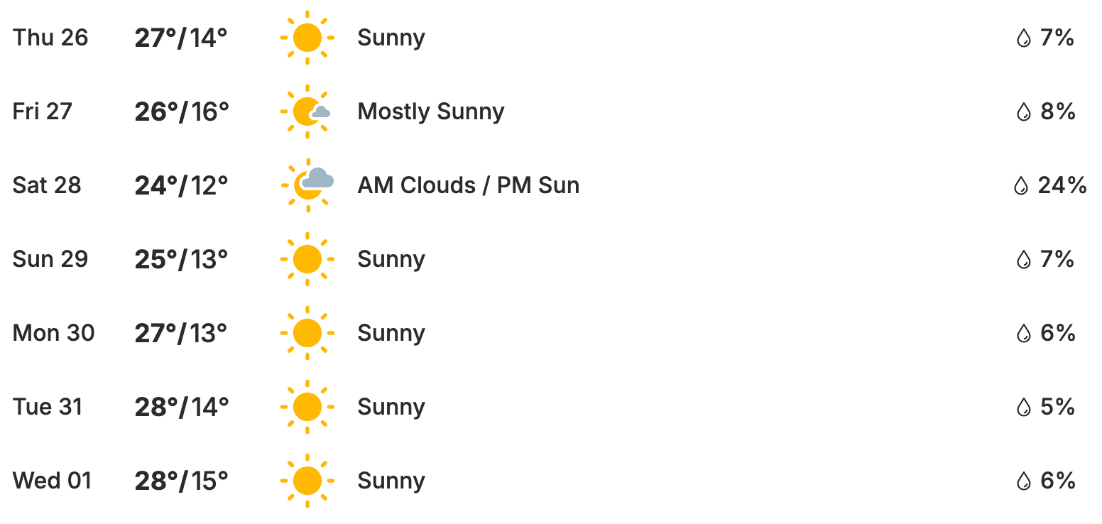 Best days? Thu, Sun, Mon & Tue - clear skies and mid-to-high 20s. Saturday brings a few morning clouds, but still clears nicely.